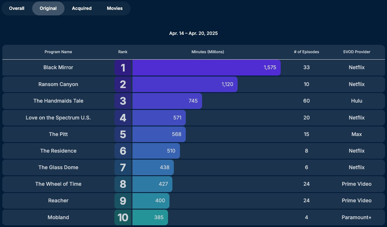 However, by the week of the release of its 6th episode, it had fallen off the charts below 470 million minutes watched.