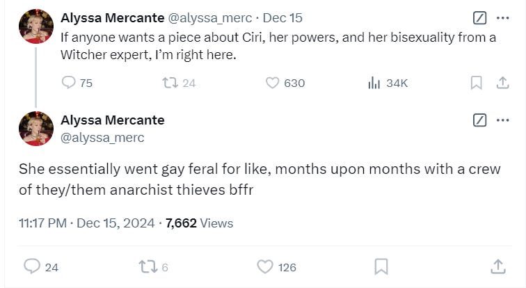 Mercante wrote on X, “If anyone wants a piece about Ciri, her powers, and her bisexuality from a Witcher expert, I’m right here.”