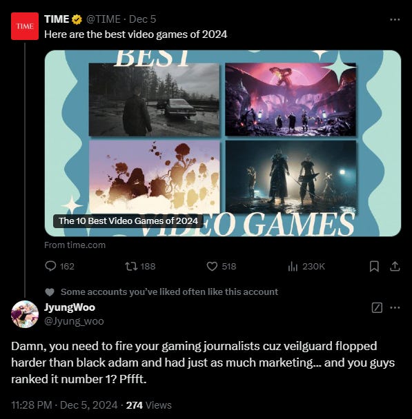 I find it interesting that no author is listed for the article. If I had to guess I'd say the assignment to do this piece was handed off to some fairly young and new hire who is obviously a woke activist, and likely because those running TIME magazine probably still think that video games are for kids and not worthy of a more talented writer. This allowed this person to basically list what their top 10 favorite games of 2024 are and not anything reflecting reality.