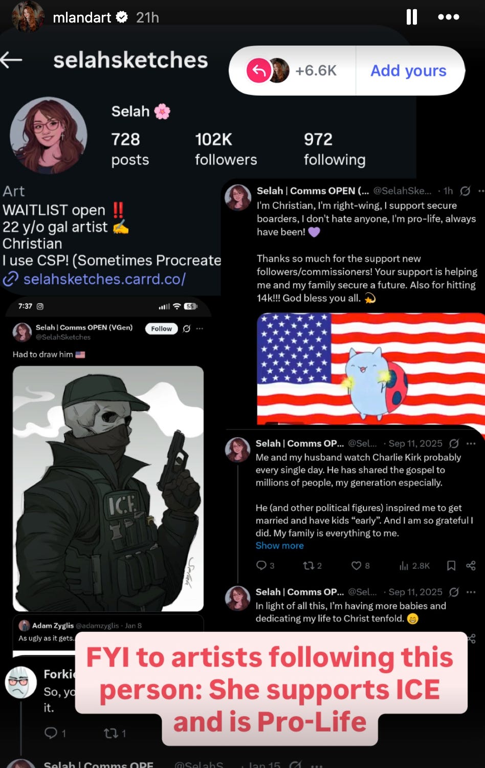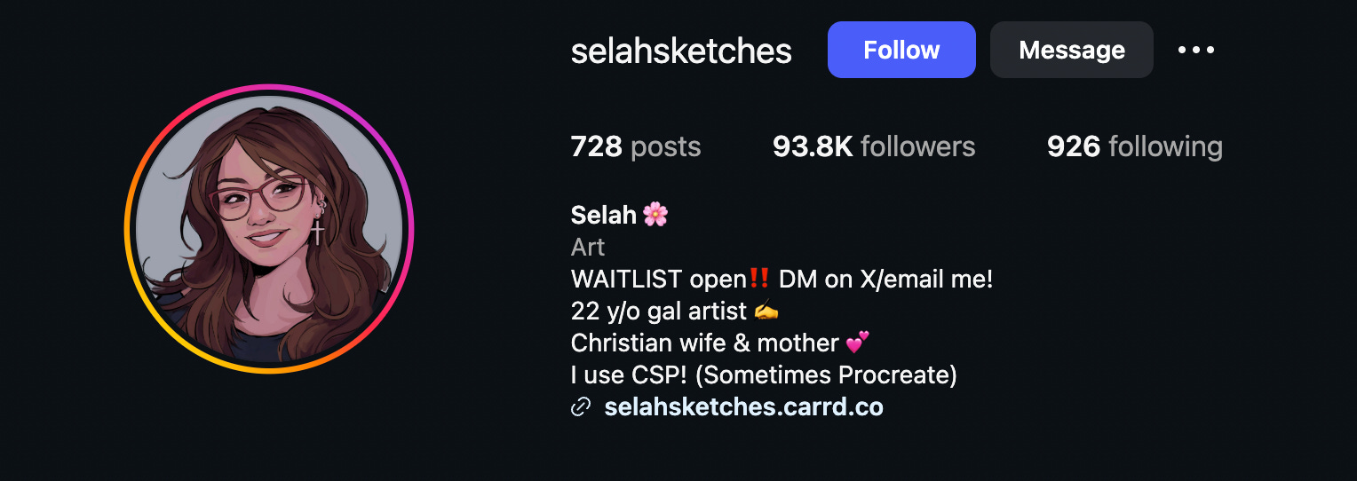 Selah Sketches is an independent artist, known for creating fantasy sketches and producing high-quality digital art. She has built her Instagram following by being patriotic and being unabashedly pro-right-wing and Christian with her work.