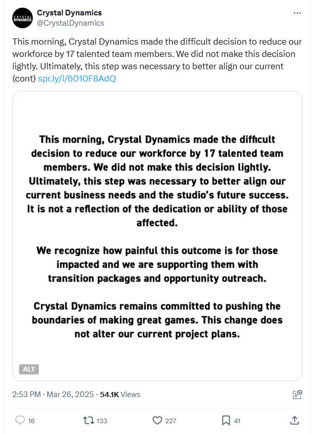 “Crystal Dynamics remains committed to pushing the boundaries of making great games,” it concluded. “This change does not alter our current project plans.”