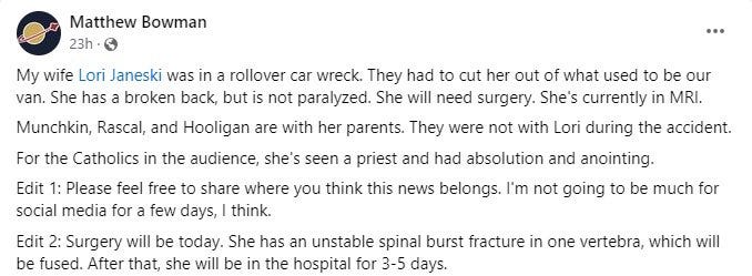 Second, Lori Janeski, best known for her independent work on The Carter Files, was involved in a bad car crash. Her husband has posted updates and urged fans to pray for them.