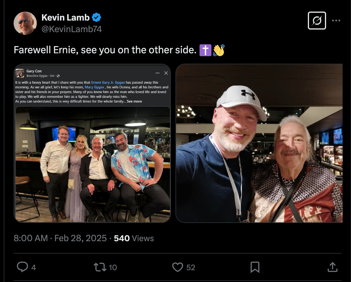 D&D expert Kevin Lamb posted pictures with Gygax, saying, “Farewell Ernie, see you on the other side.”