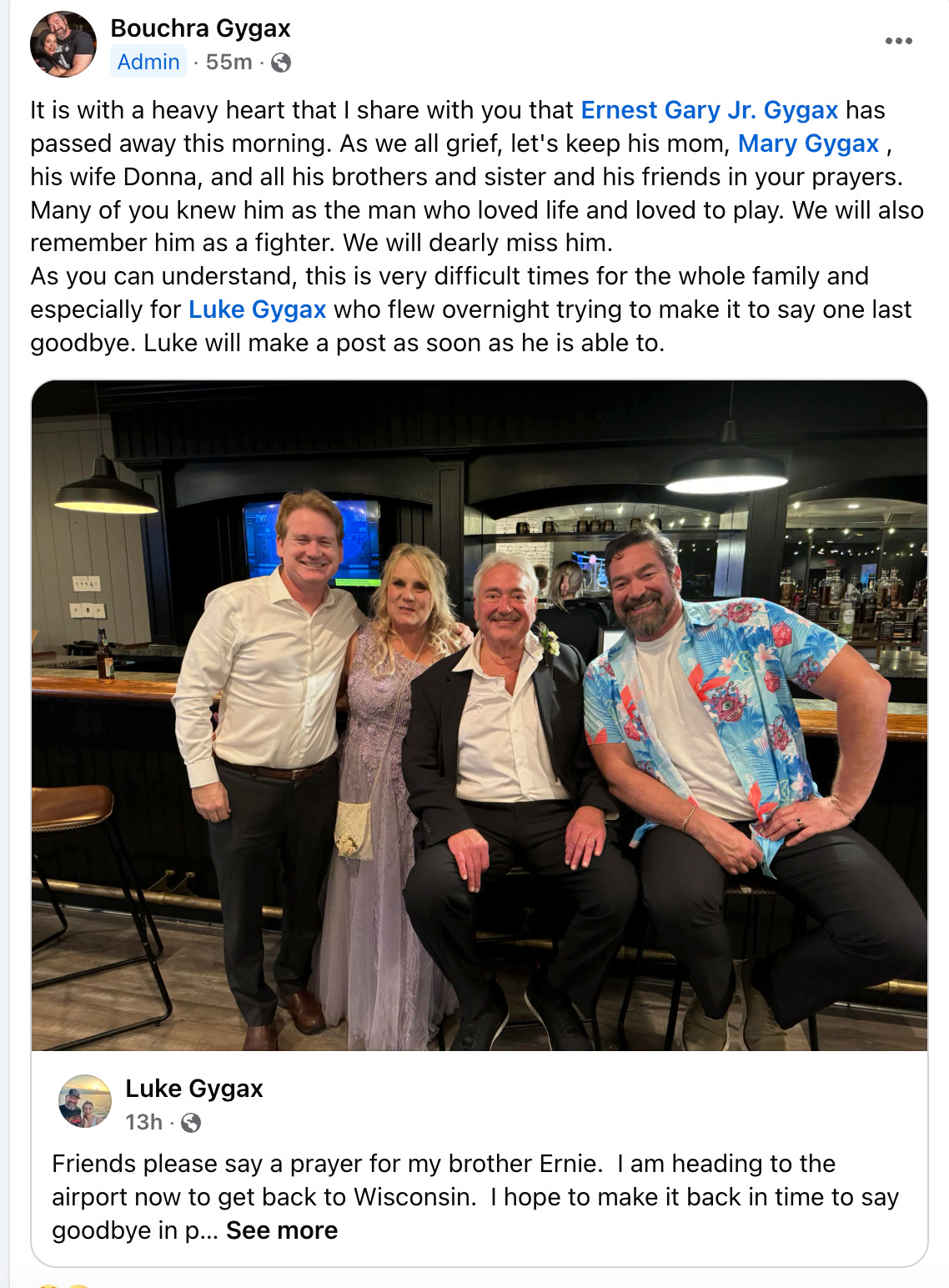 As you can understand, this is very difficult times for the whole family and especially for Luke Gygax who flew overnight trying to make it to say one last goodbye. Luke will make a post as soon as he is able to.