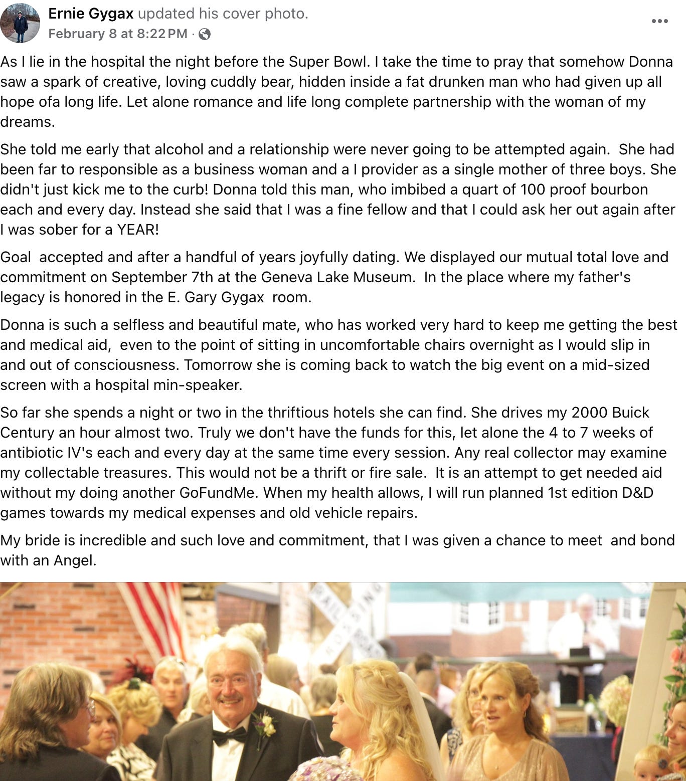 Ernie Gygax made his health problems known on February 8th on a Facebook post: