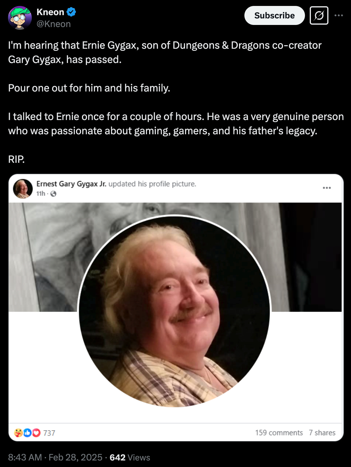 Kneon from Clownfish TV said, “I'm hearing that Ernie Gygax, son of Dungeons & Dragons co-creator Gary Gygax, has passed. Pour one out for him and his family. I talked to Ernie once for a couple of hours. He was a very genuine person who was passionate about gaming, gamers, and his father's legacy. RIP.”