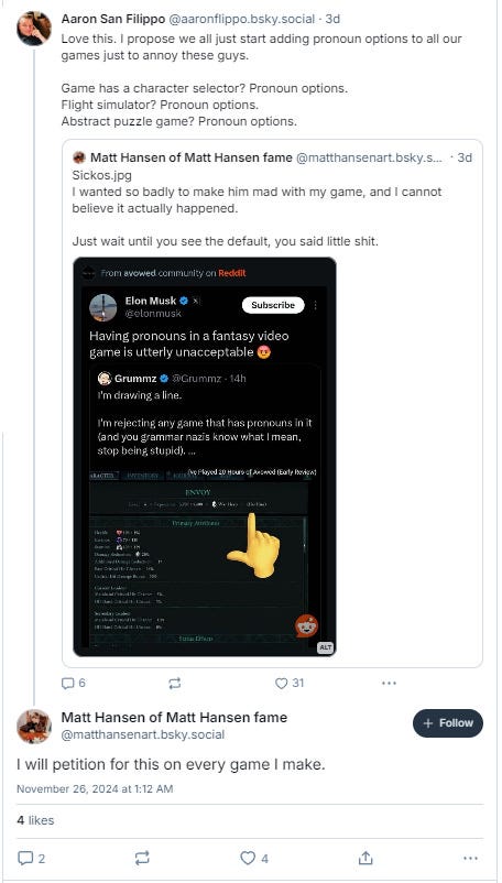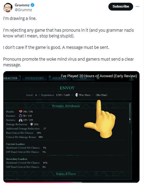 He wrote, “I'm drawing a line. I'm rejecting any game that has pronouns in it (and you grammar nazis know what I mean, stop being stupid). I don't care if the game is good. A message must be sent. Pronouns promote the woke mind virus and gamers must send a clear message.”