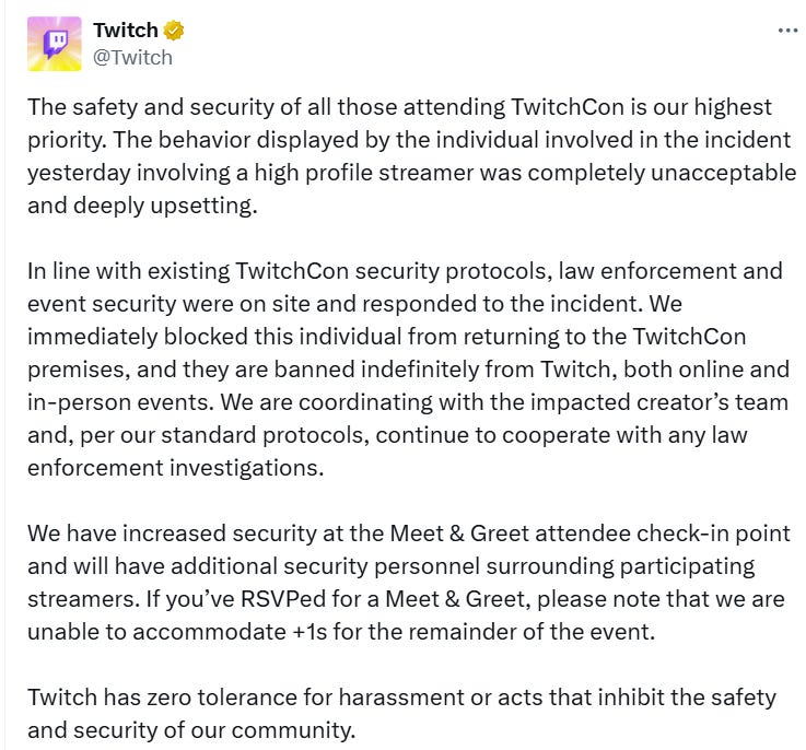Twitch pretends this is community but it’s not. This is platform-sanctioned erotic labor, optimized for profit and shielded by terms of service that ban explicit sex but reward everything leading up to it. And, unfortunately, this is why I don’t believe anything significant will even be done as a result of this incident. Instead, people will continue to feign surprise as if it is any wonder that an obsessive fan would turn physical when presented with his dream e-girl in the flesh.