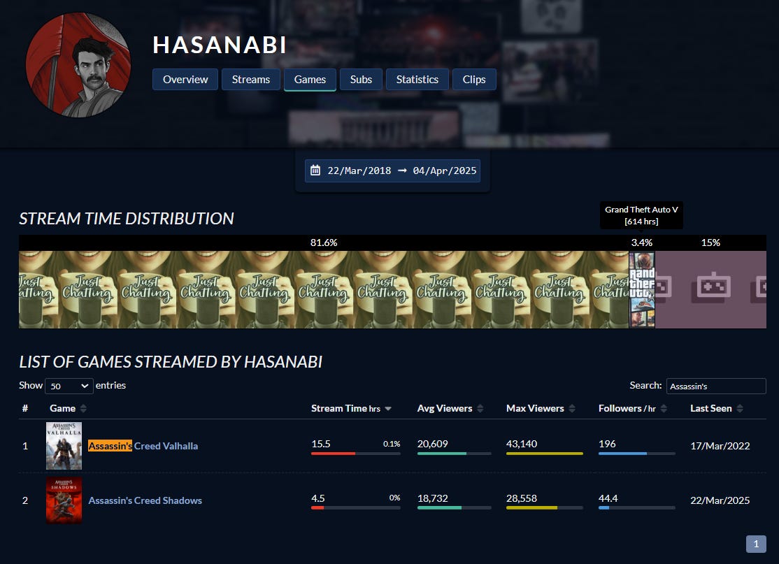 He added, “But more specifically, Hasan barely streams gaming content, and when he does it almost always sponsored. Hasan's Assassin's Creed stream came in at half the viewership his streams normally do, which indicates a lack of interest from his core audience.”