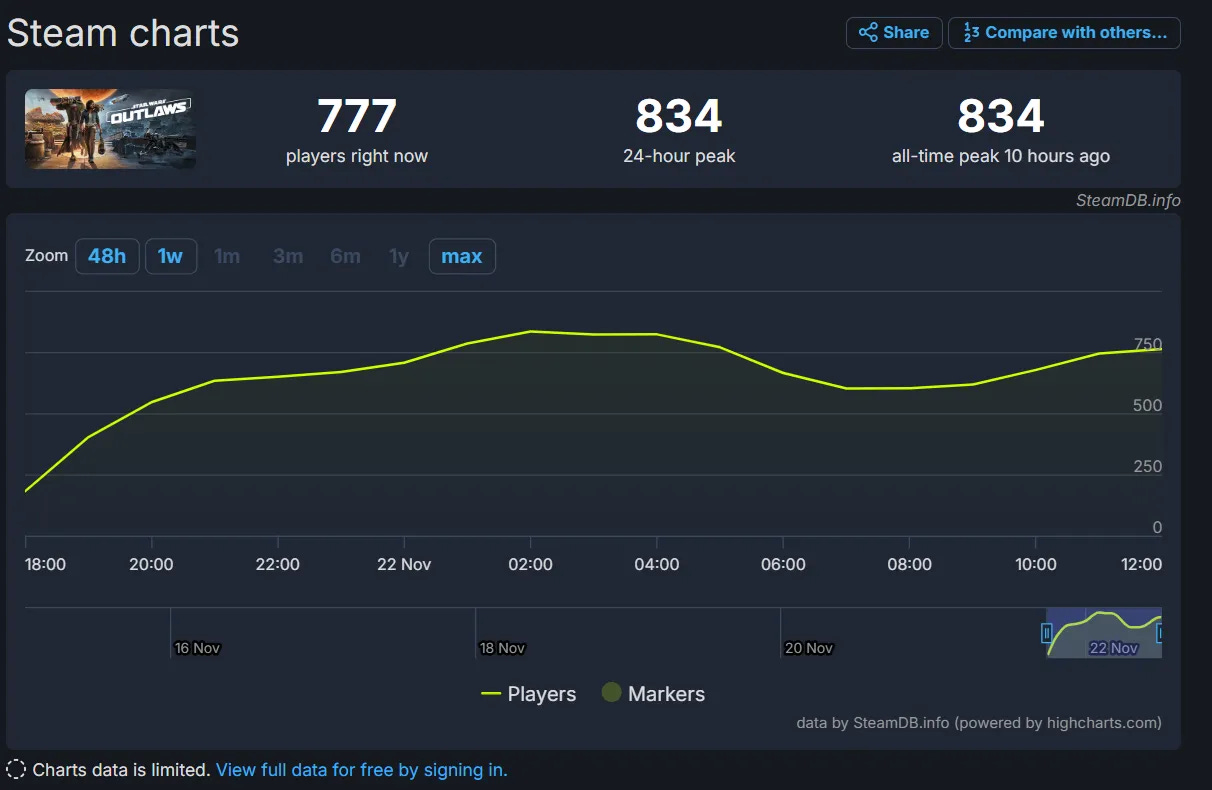 The CEO's optimism rings hollow when confronted with actual player data. Star Wars Outlaws performed 43.6% worse than Star Wars Jedi: Survivor, which managed 1,481 concurrent players on Steam. Even more embarrassing, the game's numbers were 82.8% worse than Star Wars: The Old Republic, a decade-old MMO that still managed 4,868 concurrent players. While Star Wars as a brand has taken a hit in recent years, there are also gameplay elements to Outlaws, including the aesthetically displeasing female lead, that caused problems for the game.