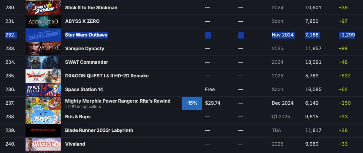 READ: 'Star Wars Outlaws' Barely In Top 250 Of Most Wishlisted Upcoming Steam Games A Day Before Release