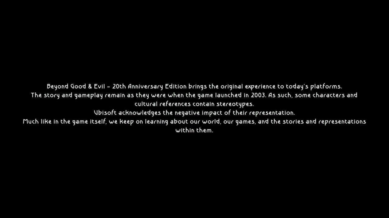 The trigger warning reads: “Beyond Good & Evil – 20th Anniversary Edition brings the original experience to today’s platforms. The story and gameplay remain as they were when the game launched in 2003. As such, some characters and cultural references contain stereotypes. Ubisoft acknowledges the negative impact of their representation. Much like in the game itself, we keep on learning about our world, our games, and the stories and representations within them.”