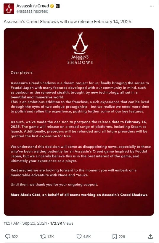 In September, Ubisoft announced in a press release, “Assassin’s Creed Shadows will now be released on 14 February 2025.”