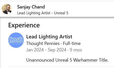 For example, Lead Lighting Artist Sanjay Chand’s LinkedIn profile notes he was working on an “Unannounced Unreal 5 Warhammer Title.”