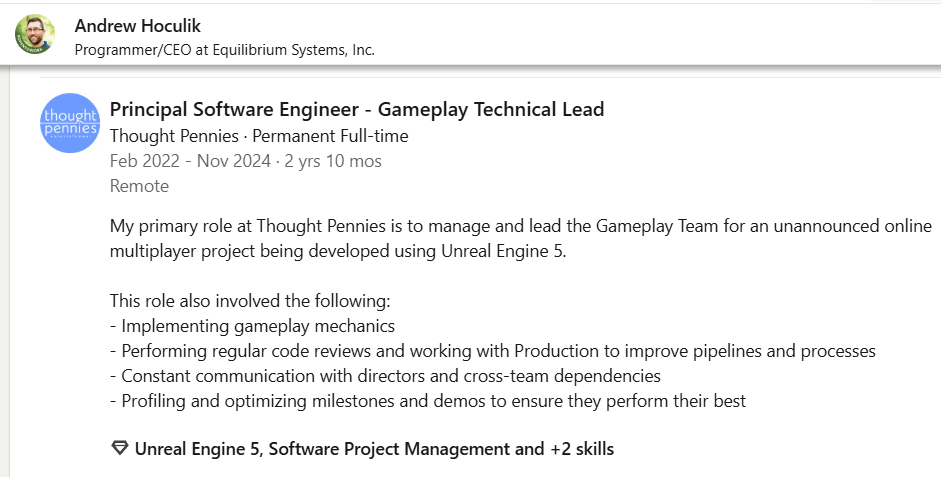 Former Gameplay Technical Lead Andrew Hoculik noted he worked an “unannounced online multiplayer project being developed using Unreal Engine 5.”