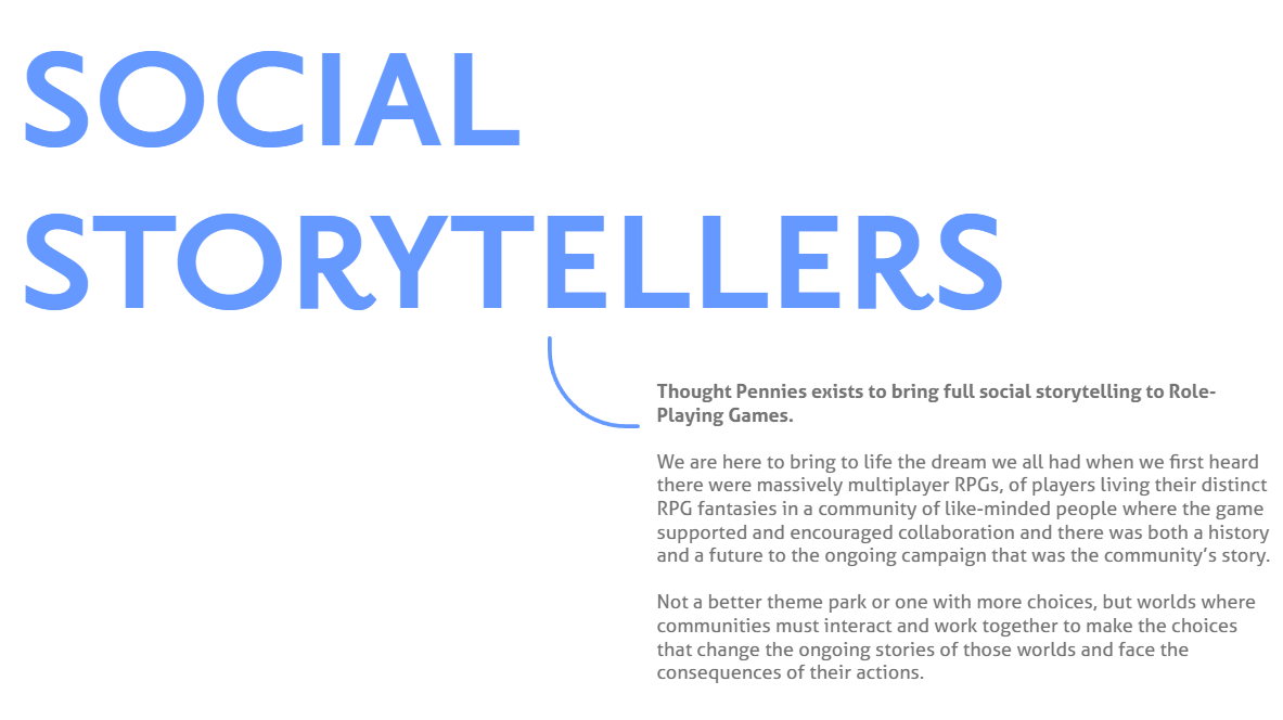 The company adds, “Thought Pennies exists to bring full social storytelling to Role-Playing Games. We are here to bring to life the dream we all had when we first heard there were massively multiplayer RPGs, of players living their distinct RPG fantasies in a community of like-minded people where the game supported and encouraged collaboration and there was both a history and a future to the ongoing campaign that was the community’s story. Not a better theme park or one with more choices, but worlds where communities must interact and work together to make the choices that change the ongoing stories of those worlds and face the consequences of their actions.”