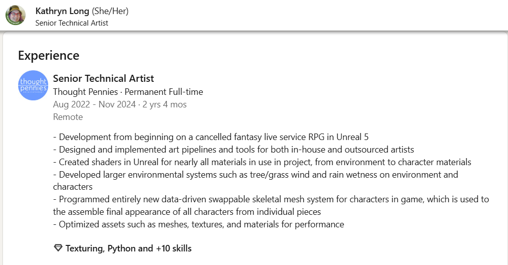Senior Technical Artist Kathryn Long noted the game was cancelled on her LinkedIn. She wrote, “Development from beginning on a cancelled fantasy live service RPG in Unreal 5.”