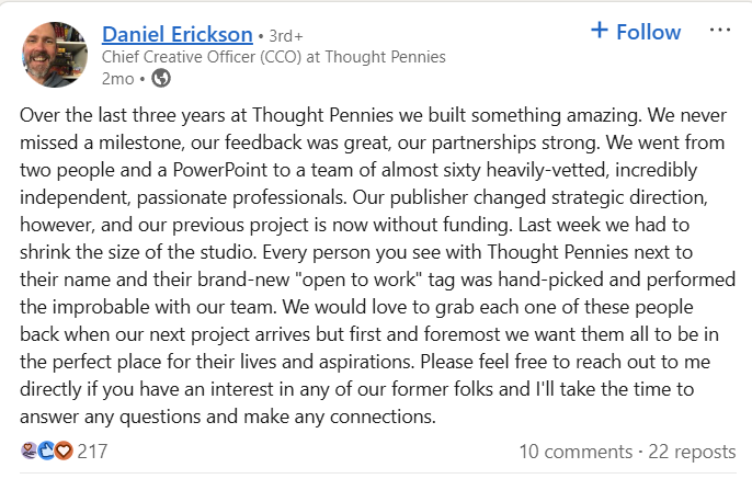 As originally reported by MP1st, Daniel Erickson, the Chief Creative Officer at Thought Pennies, shared on LinkedIn about two months ago, “Over the last three years at Thought Pennies we built something amazing. We never missed a milestone, our feedback was great, our partnerships strong. We went from two people and a PowerPoint to a team of almost sixty heavily-vetted, incredibly independent, passionate professionals.”