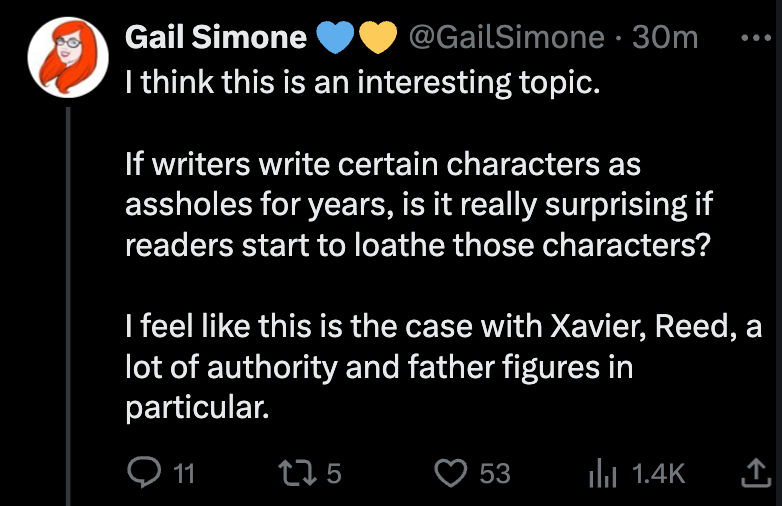 She started talking about the X-Men and not fridging, saying, “think this is an interesting topic. If writers write certain characters as assholes for years, is it really surprising if readers start to loathe those characters? I feel like this is the case with Xavier, Reed, a lot of authority and father figures in particular.”