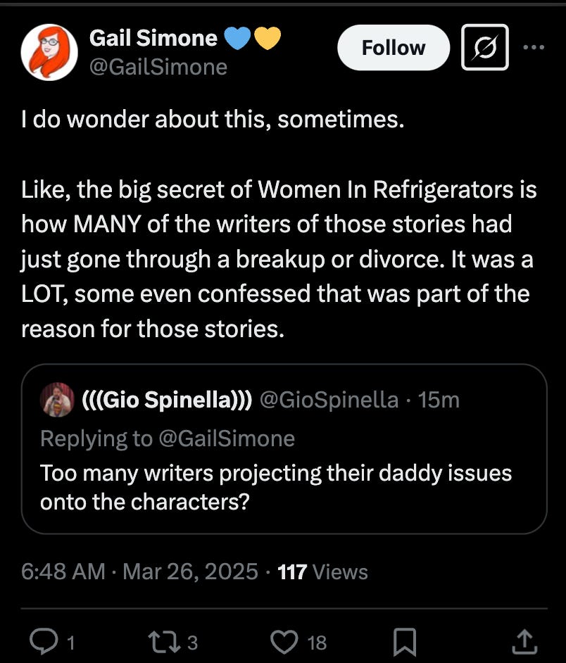 Here, she tied it back into men’s sexism claiming it was because of divorce situations with the writers, “I do wonder about this, sometimes. Like, the big secret of Women In Refrigerators is how MANY of the writers of those stories had just gone through a breakup or divorce. It was a LOT, some even confessed that was part of the reason for those stories.”
