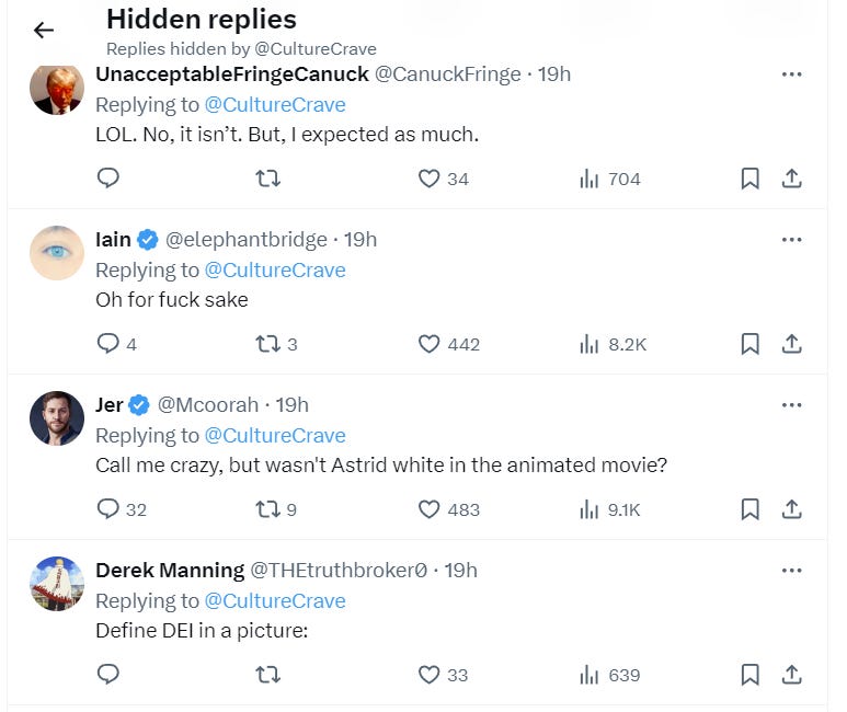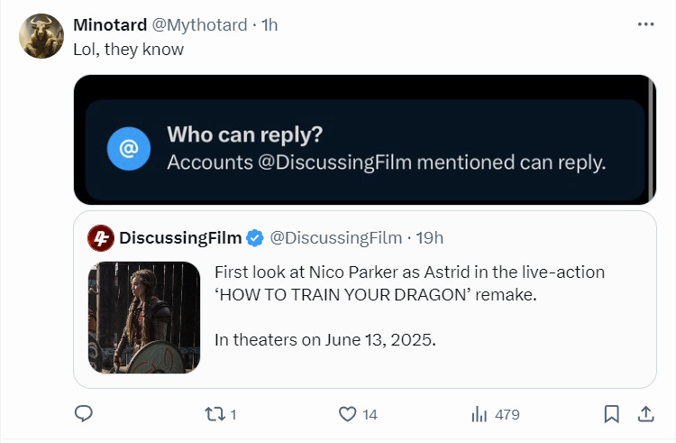 Culture Crave also shared the image and while it did not turn off replies, it began mass hiding numerous responses criticizing the casting. The account wrote, “First look at Nico Parker as Astrid in the live-action How To Train Your Dragon.”