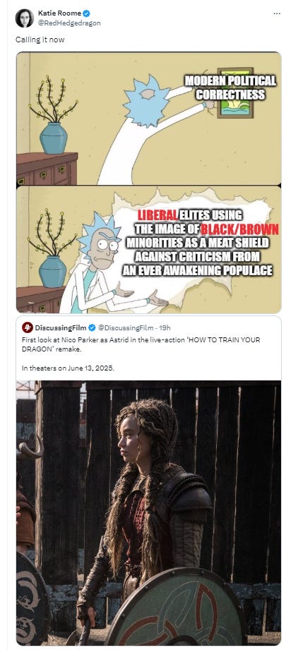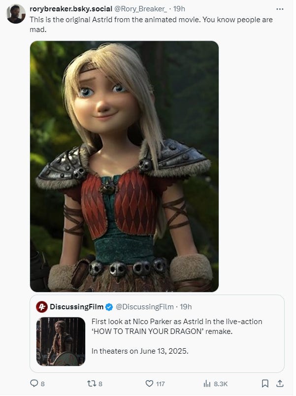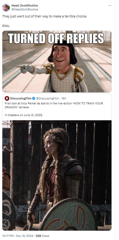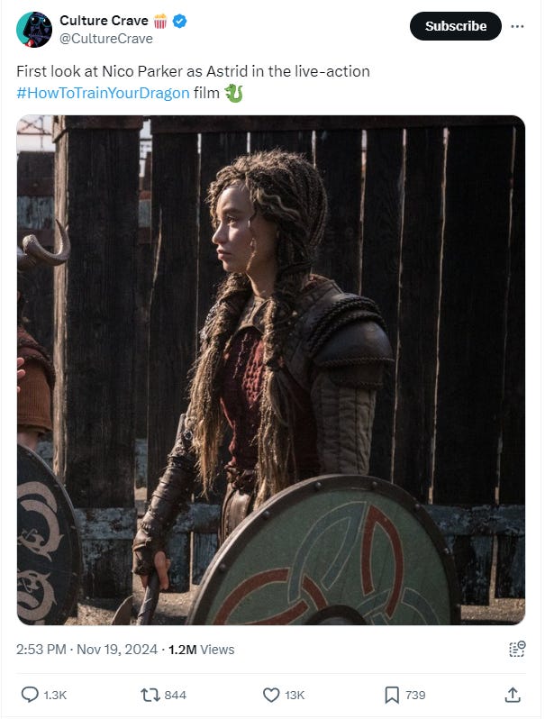 This live-action adaptation is expected to arrive in theaters on June 13, 2025. What do you make of Hollywood and its sycophants getting blasted over the race swap of Astrid in How To Train Your Dragon? Become a paid member to leave a comment and let us know.