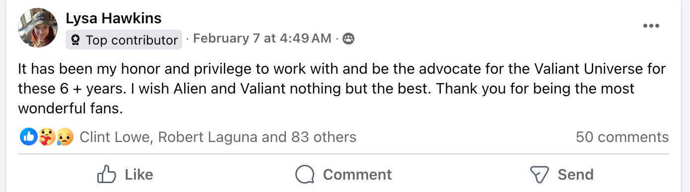 That reorganization hit hard another day later when Lysa Hawkins announced she was no longer with the company. She posted to the Valiant Comic Book Fans Facebook group, saying, “It has been my honor and privilege to work with and be the advocate for the Valiant Universe for these 6 + years. I wish Alien and Valiant nothing but the best. Thank you for being the most wonderful fans.”