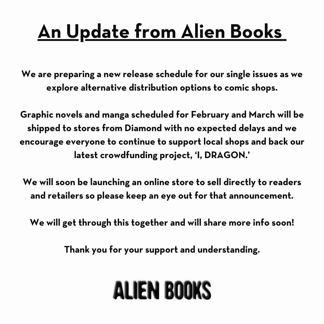 A week later, Alien Books posted to Facebook that they were trying to reorganize to get a single issue release schedule going for the company. They announced moving to an online stores direct-to-readers model to cut out distributors and comic shops to reshape how they do business.