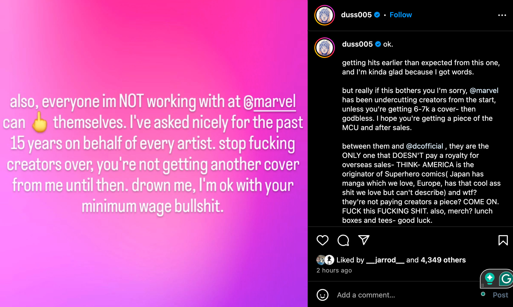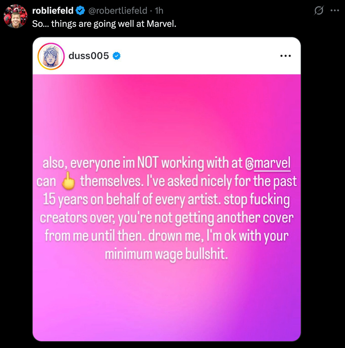 Dustin Nguyen spoke out today on Instagram, posting, “also everyone Im NOT working with at @marvel can **** themselves. I’ve asked nicely for the past 5 years on behalf of every artist. Stop f***ing creators over, you’re not getting another cover from me until then. Drown me, I’m ok with your minimum wage bulls****.”