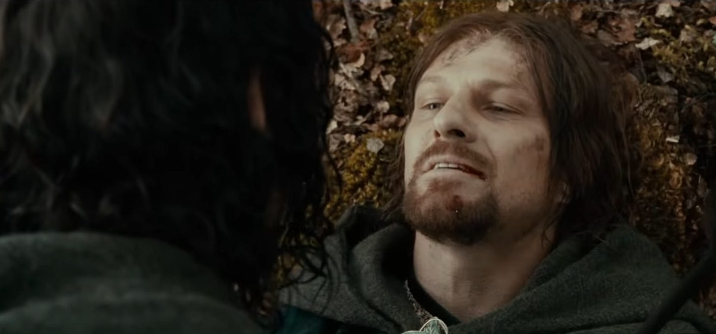 When he attempt to remove one of the arrows and treat his wound, Boromir responds, “Leave it. It is over. The world of Men will fall and all will come to darkness and my city to ruin.”