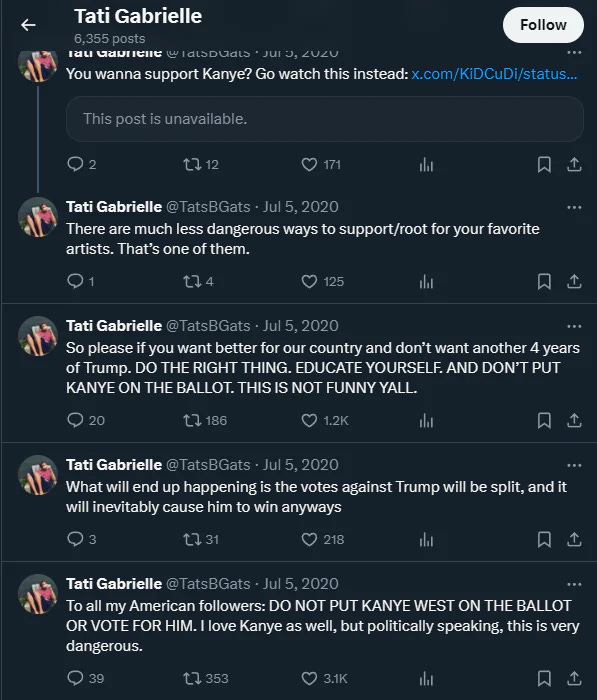 Despite not having much of a presence on Twitter/X, a cursory glance at her timeline revealed several posts from 2020 where Ms. Gabrielle was pleading with people not to vote for Kanye West in the 2020 presidential election, as it could lead to another 4 years of Donald Trump in the White House.