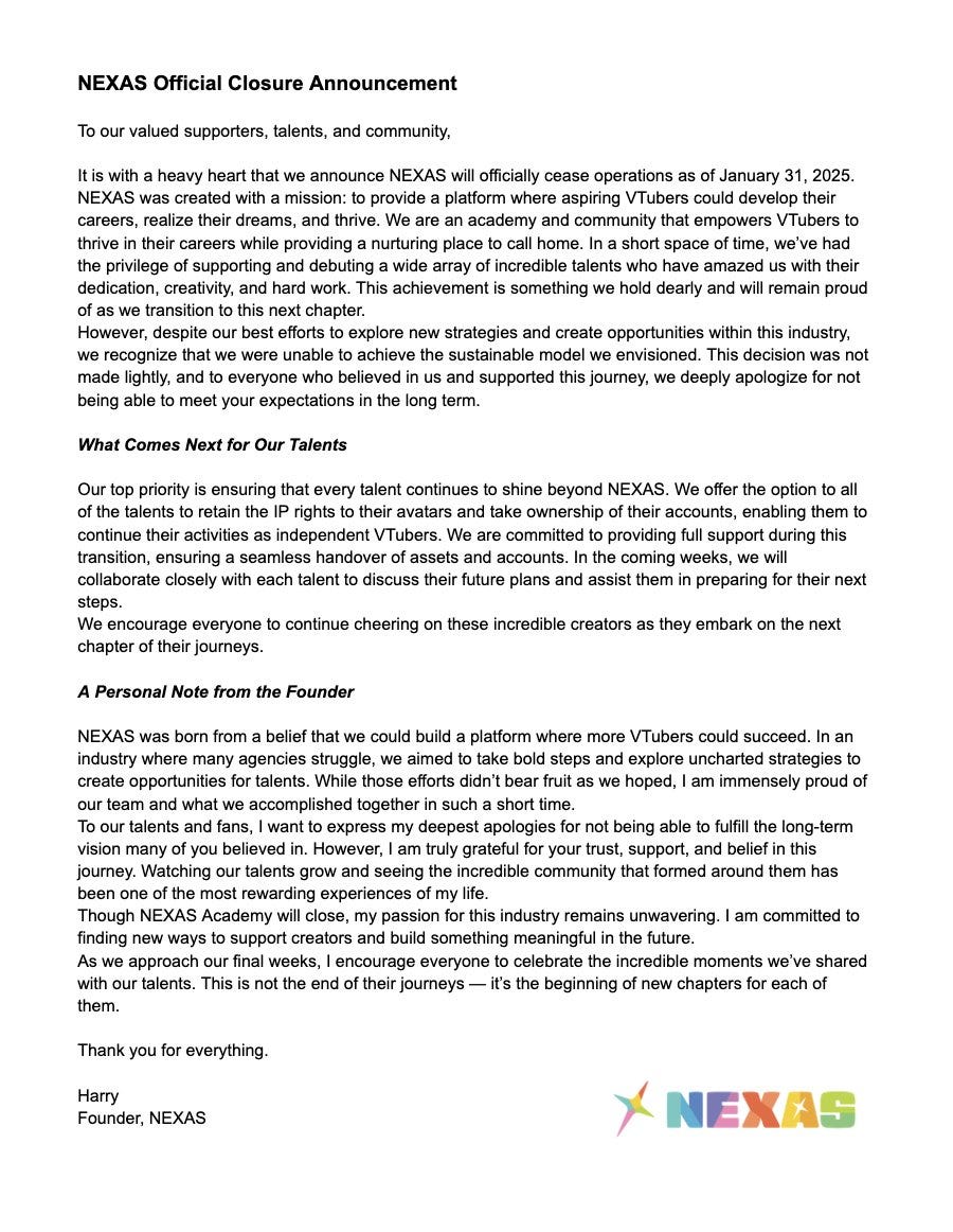 “Our top priority is ensuring that every talent continues to shine beyond NEXAS. We offer the option to all of the talents to retain the IP rights to their avatars and take ownership of their accounts, enabling them to continue their activities as independent VTubers. We are committed to providing full support during this transition, ensuring a seamless handover of assets and accounts. In the coming weeks, we will collaborate closely with each talent to discuss their future plans and assist them in preparing for their next steps.”