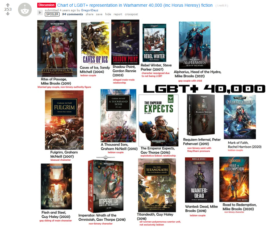 Back in 2021, Reddit user GregoriDayz shared a graphic that included 15 Warhammer 40,000 novels with LGBTQ+ representation.