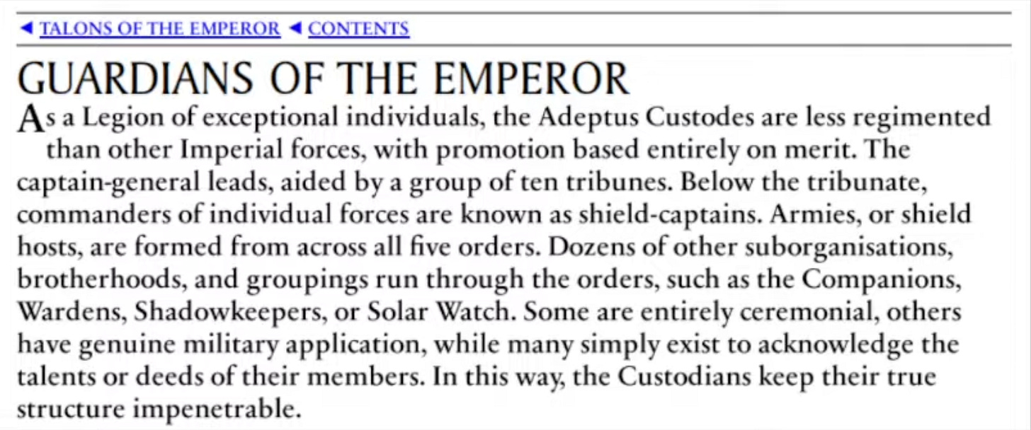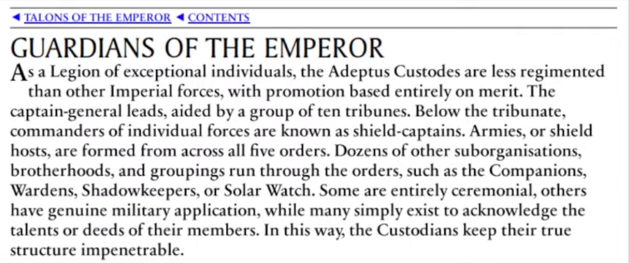 In a section about the Adeptus Custodes titled The Guardians Of The Emperor, the book says “As a legion of individuals, the Adeptus Custodes are less regimented than other Imperial forces, with promotion based entirely on merit. The captain-general leads, aided by a group of ten tributes. Below the tribunate, commanders of individual forces are known as shield-captains. Armies, or shield hosts, are formed across all five orders. Dozens of other suborganisations, brotherhoods, and groupings run through sthe orders, such as the Companions, Wardens, Shadowkeepers, or Solar Watch. Some are entirely ceremonial, others have genuine military application, while many simply exist to acknowledge the talents or deeds of their members. In this way, the Custodians keep their true structure impenetrable.”