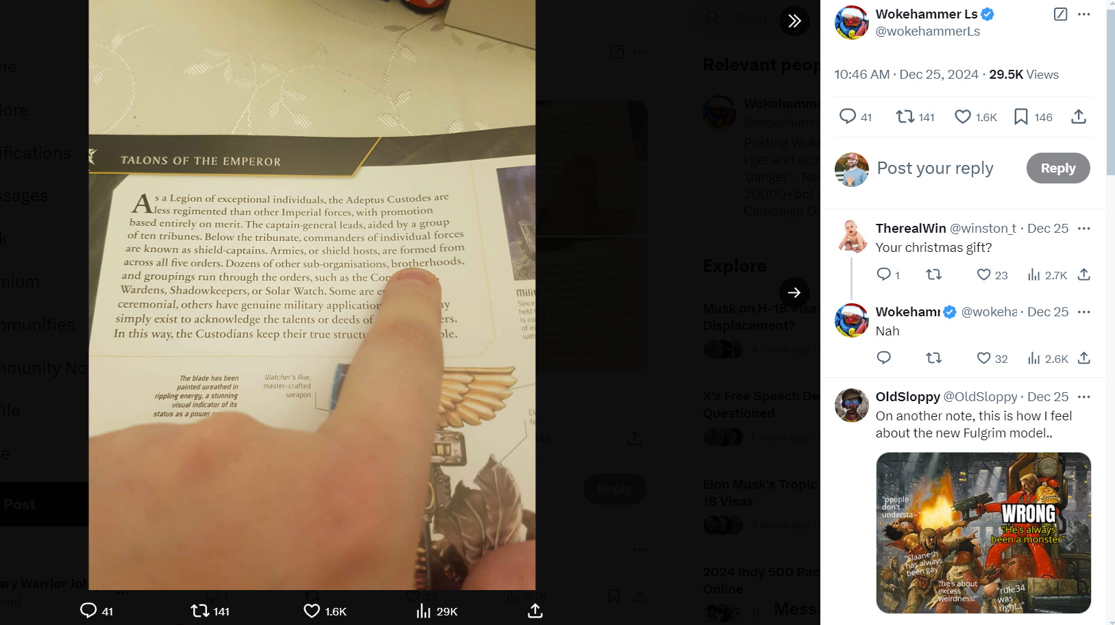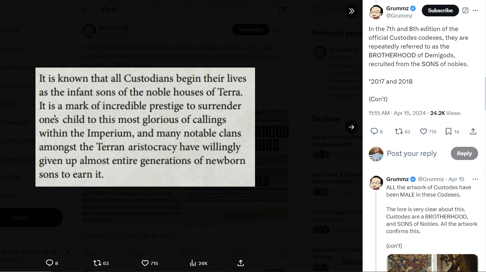 A number of Warhammer 40,000 fans believed that Games Workshop might have retconned their own retcon of female Adeptus Custodes based on the book, given it describes Custodes as “brotherhoods.”
