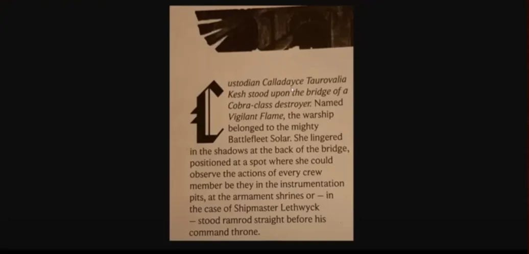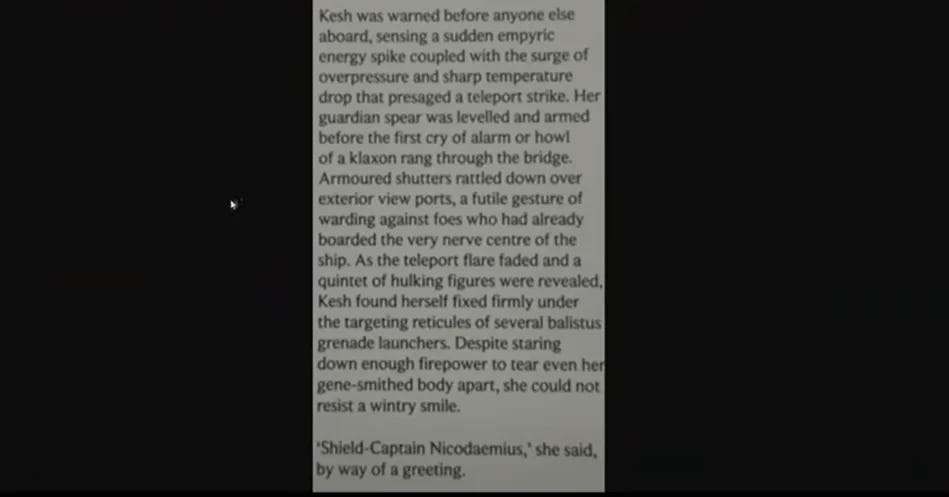 Another excerpt makes it clear the that Kesh is indeed a female Custodes given that she wields a guardian spear. It states, “Kesh was warned before anyone else aboard, sensing a sudden empyric energy spike coupled with the surge of overpressure and sharp temperature drop that presaged a teleport strike. Her guardian spear was levelled and armed before the first cry of alarm or howl of a klaxon rang through the bridge.”