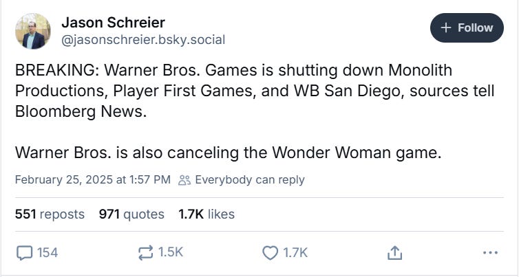 In a follow-up post, Schreier put the blame for these closings on Warner Bros. Games President David Haddad, who announced he was exiting the company at the end of January.