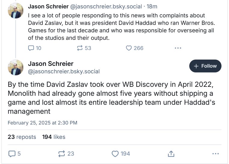 Schreier wrote, “I see a lot of people responding to this news with complaints about David Zaslav, but it was president David Haddad who ran Warner Bros. Games for the last decade and who was responsible for overseeing all of the studios and their output.”