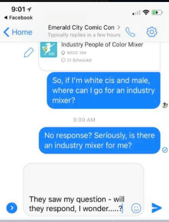 Emerald City Comic Con came under scrutiny in 2018 for their segregation-related events, running industry mixers for “Women & Genderqueer,” “LGBTQIA,” and “Industry People Of Color.” However, there were none held for white male attendees, showing clear discrimination that did not provide equal space at all.
