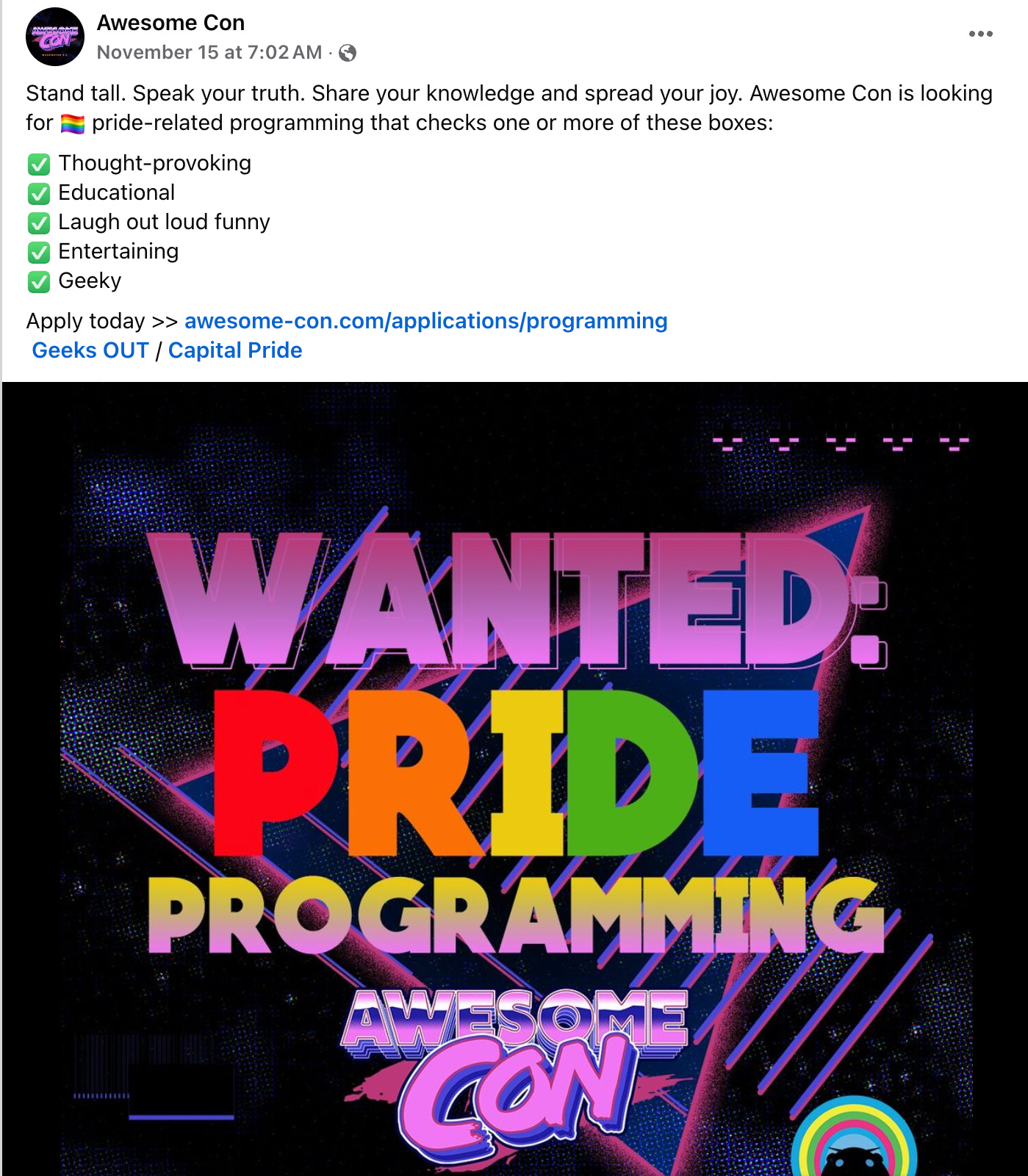 “Stand tall. Speak your truth. Share your knowledge and spread your joy. Awesome Con is looking for pride-related programming that checks one or more of these boxes: Thought-provoking, Educational, Laugh out loud funny, Entertaining, Geeky, Apply today >> awesome-con.com/applications/programming Geeks OUT / Capital Pride”