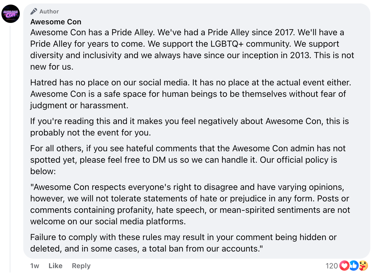 “’Awesome Con respects everyone's right to disagree and have varying opinions, however, we will not tolerate statements of hate or prejudice in any form. Posts or comments containing profanity, hate speech, or mean-spirited sentiments are not welcome on our social media platforms.’”