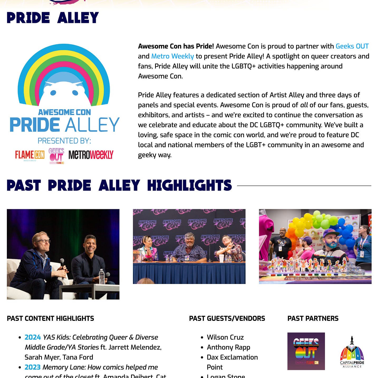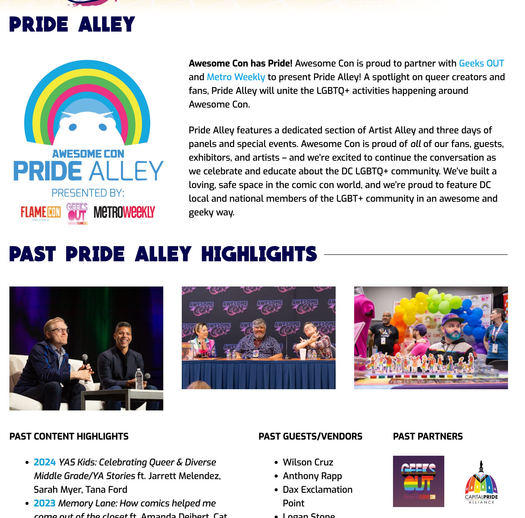 “Awesome Con has Pride! Awesome Con is proud to partner with Geeks OUT and Metro Weekly to present Pride Alley! A spotlight on queer creators and fans, Pride Alley will unite the LGBTQ+ activities happening around Awesome Con.”