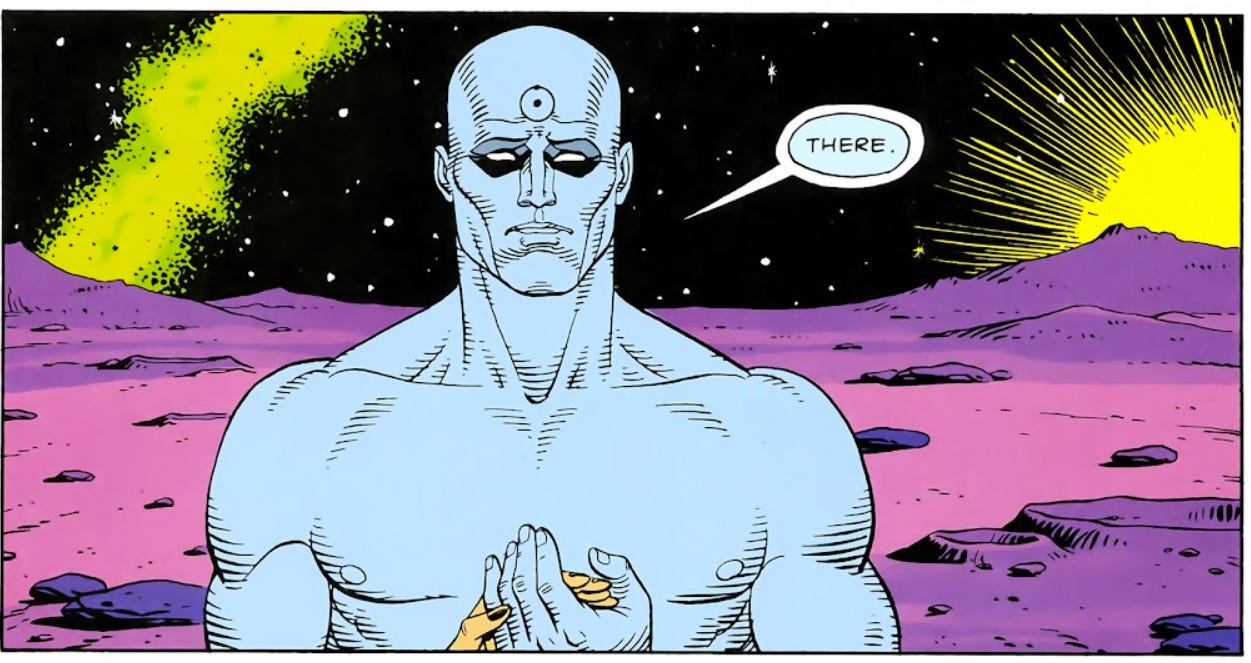 Watchmen is one of the most read graphic novels, but the book’s ending reveals that Dr. Manhattan is not as logical as Alan Moore wants him to be and in fact he fails a major logical test when he chooses to side with Adrian Veidt and murder Rorshach.
