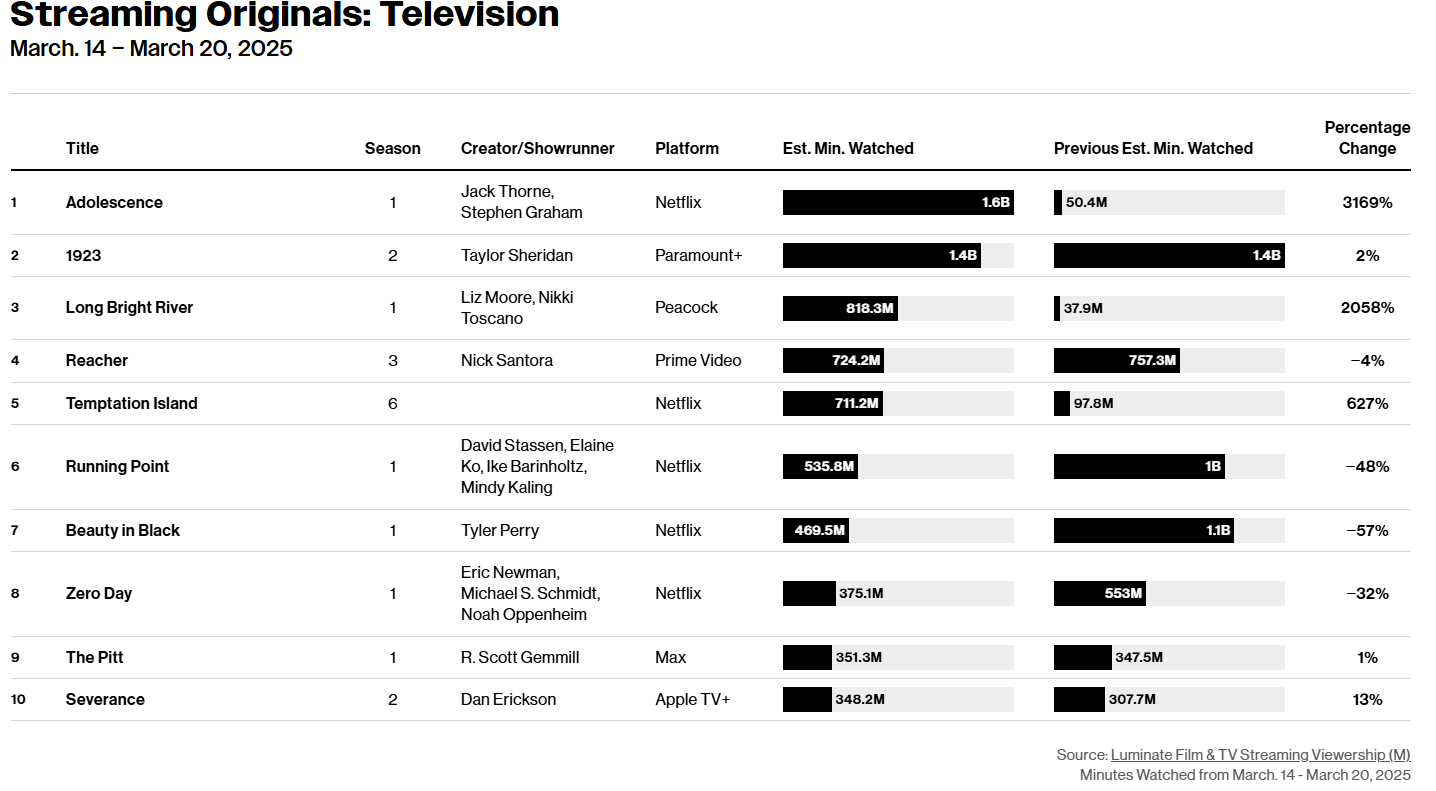 The three-episode premiere on March 13th did not chart on Luminate’s Streaming Originals: Television chart for the week of March 6th to March 13th.
