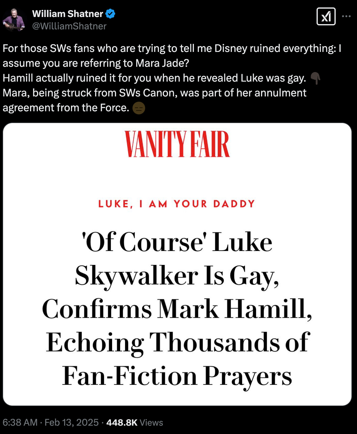 Shatner delivered a rhetorical kill shot reminding fans that Mark Hamill in fact said Luke Skywalker was gay, and also reminding fans what they lost when Disney ignored the novel extended universe.