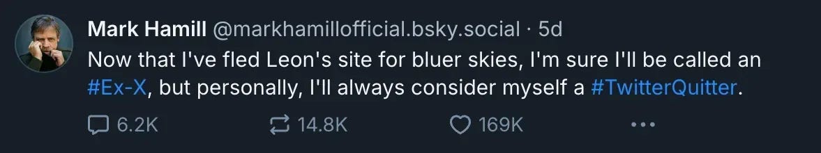After the election, however, Hamill followed the trend of many Hollywood celebrities, blaming X for the election of Donald Trump and Elon Musk by proxy, and he virtue signaled by saying he was going to leave X for BlueSky, saying, “Now that I've fled Leon's site for bluer skies, I'm sure I'll be called an Ex-X, but personally, I'll always consider myself a #TwitterQuitter.”
