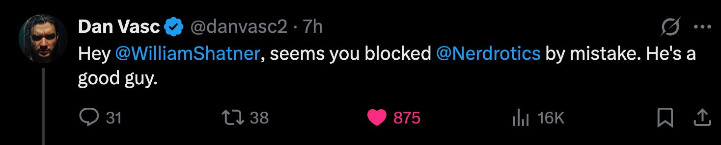 Dan Vasc noticed that Nerdrotic was blocked and tagged William Shatner in the process, going viral on the topic. He said, “Hey @WilliamShatner, seems you blocked @Nerdrotics by mistake. He’s a good guy.”