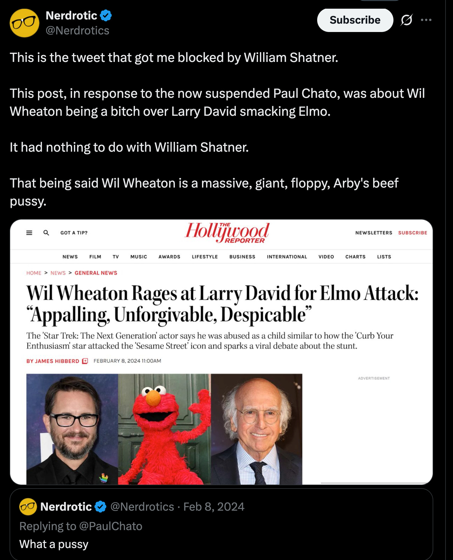 He posted to his feed, saying, “This is the tweet that got me blocked by William Shatner. This post, in response to the now suspended Paul Chato, was about Wil Wheaton being a bitch over Larry David smacking Elmo. It had nothing to do with William Shatner. That being said Wil Wheaton is a massive, giant, floppy, Arby's beef pussy.”