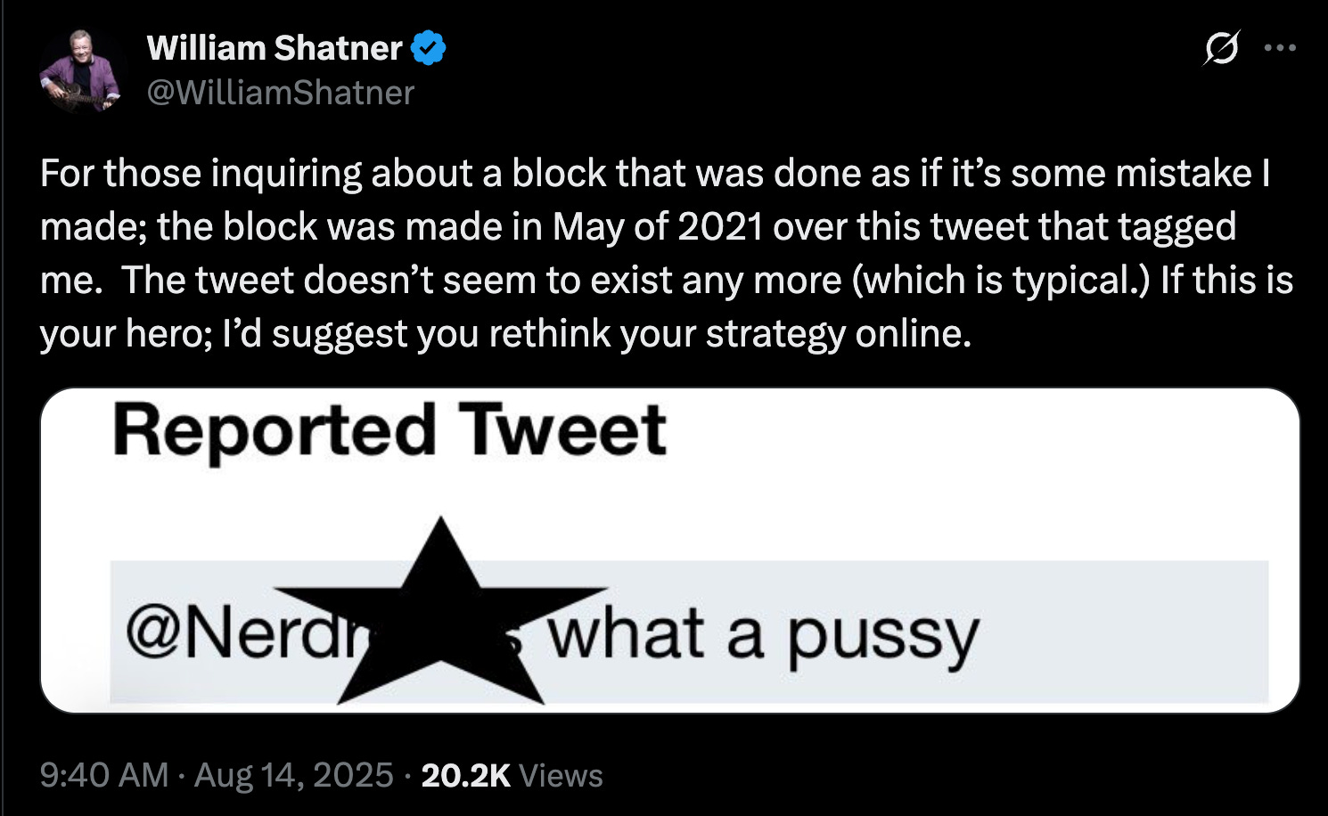 The tweet in question appeared to show Nerdrotics calling Mr. Shatner a “pussy,” however, Nerdrotics clarified that the post did not involve Shatner nor tag him at all.