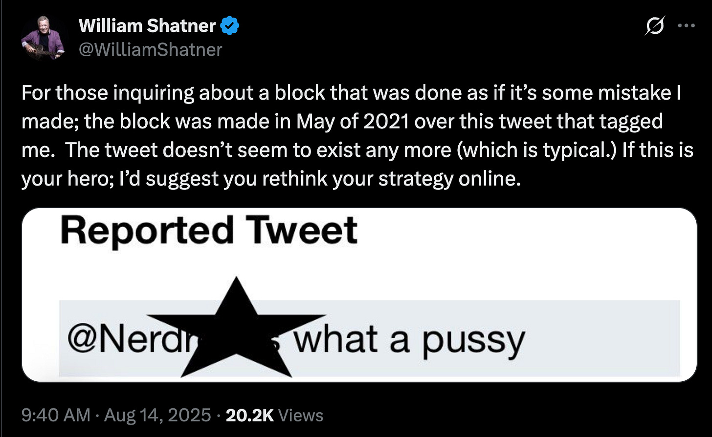 In fact, someone else got blocked who was a friend of Shatner's and they phoned him about it to apologize. Shatner was clueless and said, "I did? Not me." Turns out he has someone else handle his posts and account.